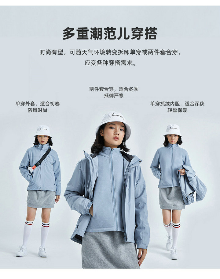 新款防水透气情侣冲锋衣,采用优质面料、摇粒绒内胆,接缝压胶工艺,轻松应对户外下雨天气,一衣三种穿法,适应不同季节。现货供应,可加印logo,印刷或刺绣均可,详情可咨询客服。