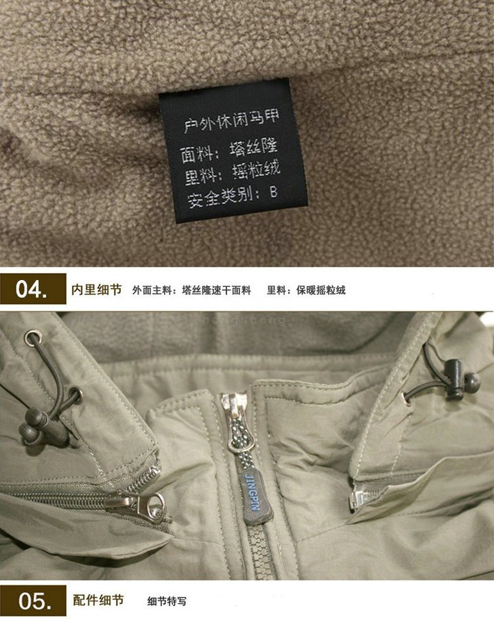 多口袋户外休闲马甲,里层采用保暖摇粒绒面料,防风可拆卸连帽设计 ,长期现货供应,可印字刺绣LOGO,欢迎咨询选购。